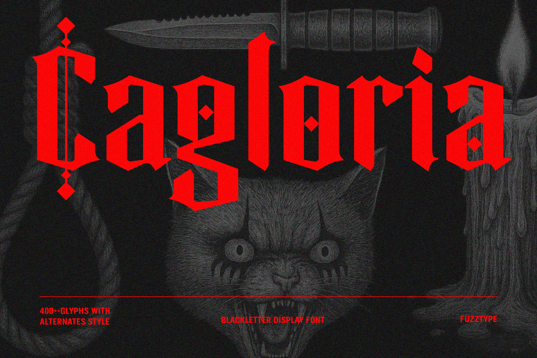 With over 400+ glyphs and alternate styles, Cagloria offers versatile options for logos, posters, apparel, tattoos, music covers, or any design seeking dark, rebellious energy.