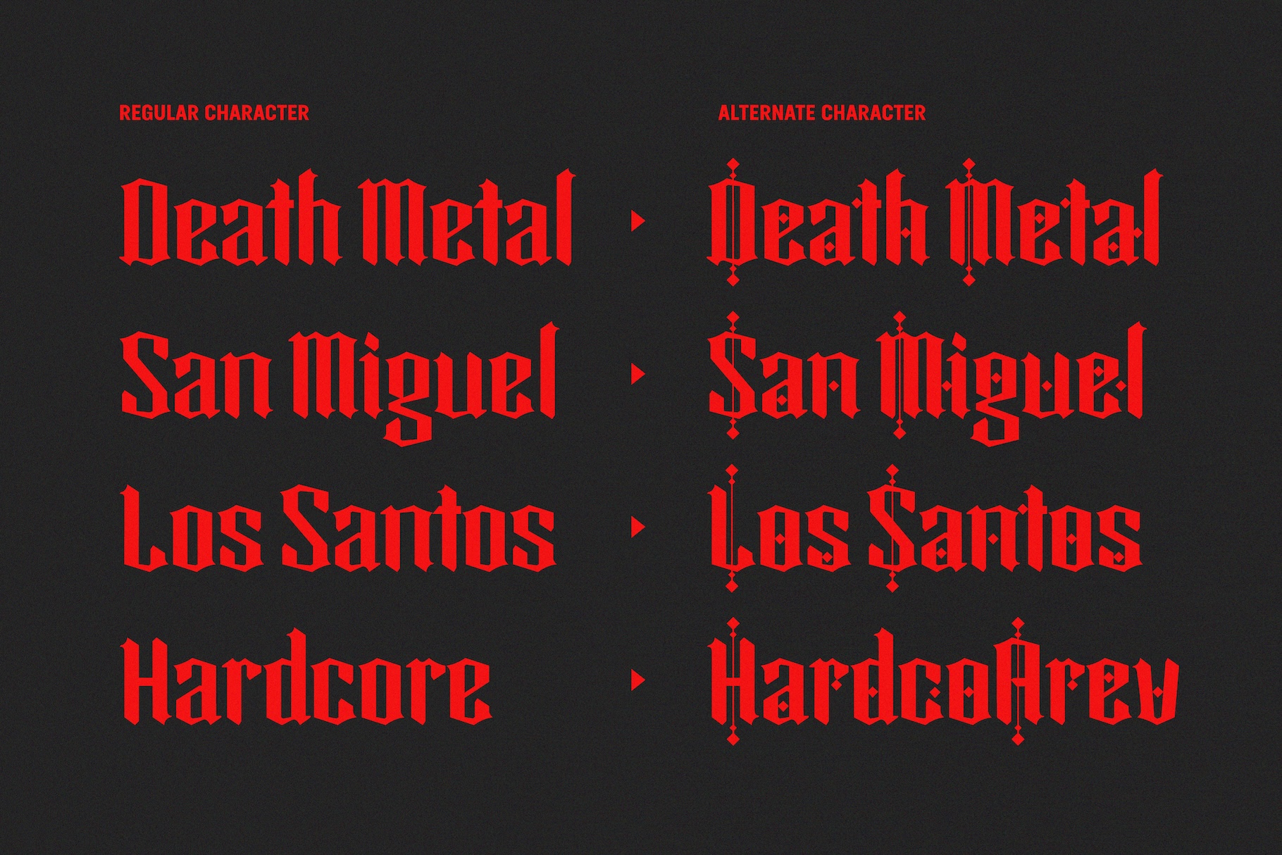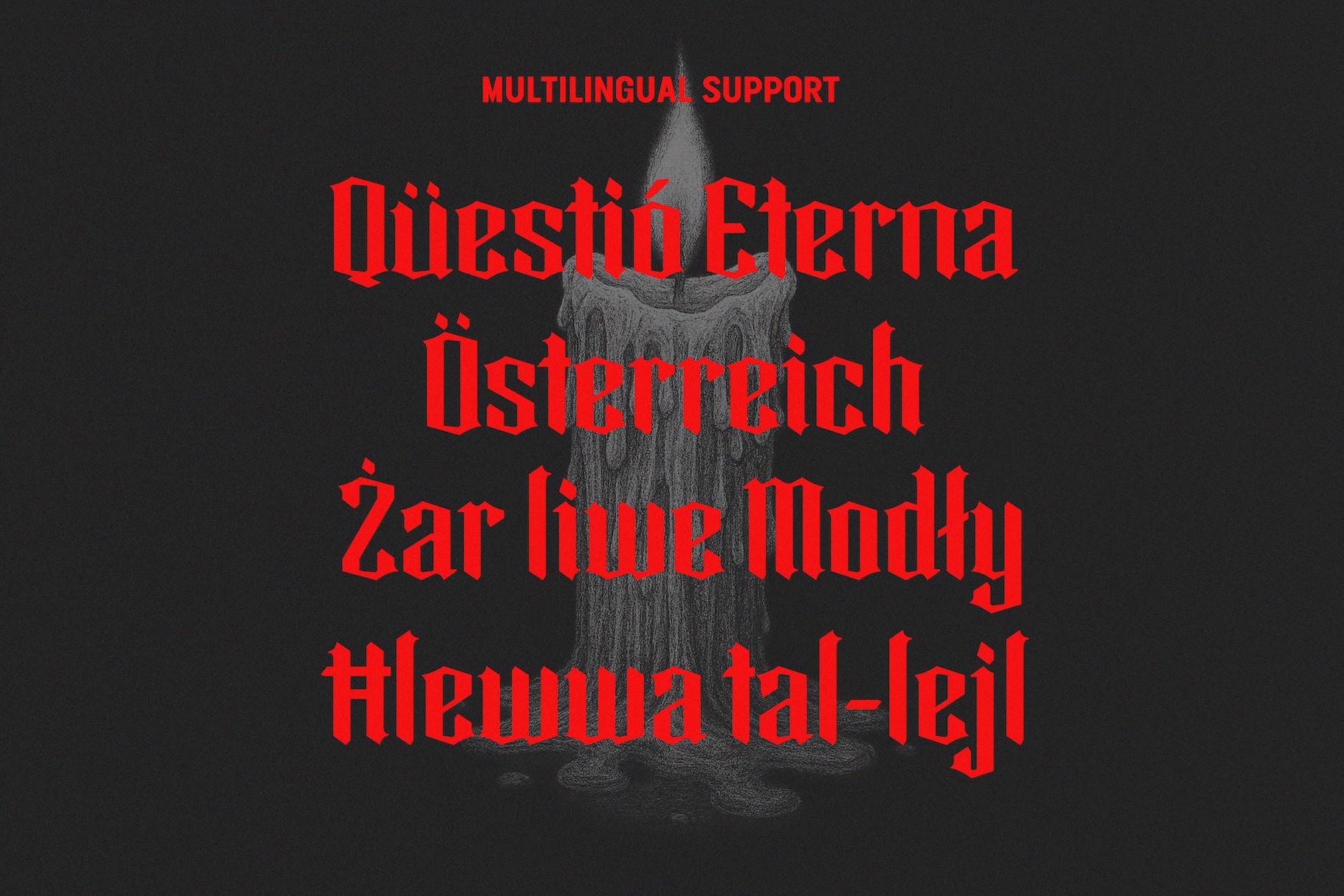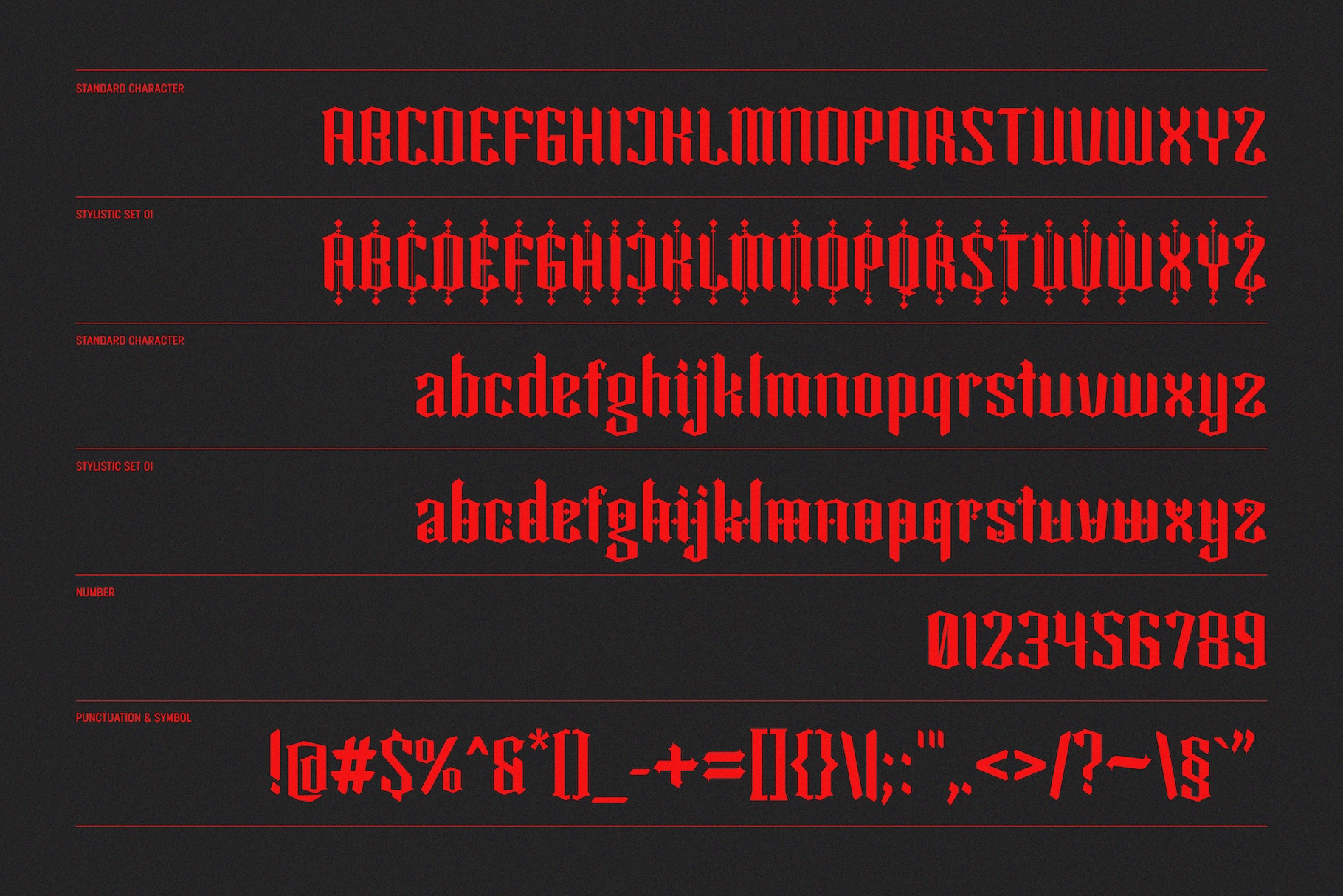 Its sharp strokes, diamond-shaped accents, and modern alternates bring a unique twist to traditional blackletter typography.